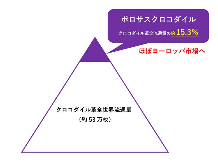 このクロコダイル革の全世界流通量は約53万枚で、その中でも特に人気のポロサスクロコダイルの占める割合は約15.3%(約8.1万枚)ですがこれらはほぼヨーロッパ市場へ輸出されます。これはヨーロッパのスーパーブランド自体が養殖場を運営しており、取引量自体は増えてきてはいますが、ほぼヨーロッパに送られるためそれ以外の地域にはなかなか回ってこないのが現状です。