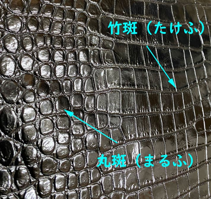 その理由は、ほかのクロコダイルと比べて鱗が細かく美麗に揃っているのが一番の特徴で、四角の鱗(竹斑)と両脇の丸い鱗(丸斑)の黄金比といっても過言ではないバランスの良さこれが人気の理由です。