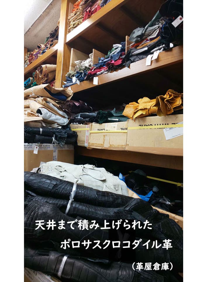 これは仕入れ先の革屋さんと養殖場との長年培われてきた信頼関係が一番の理由ですが、本来商社などを通して行う取引を革屋さんが現地まで足を運び直接仕入れているのも理由の一つもといえます。