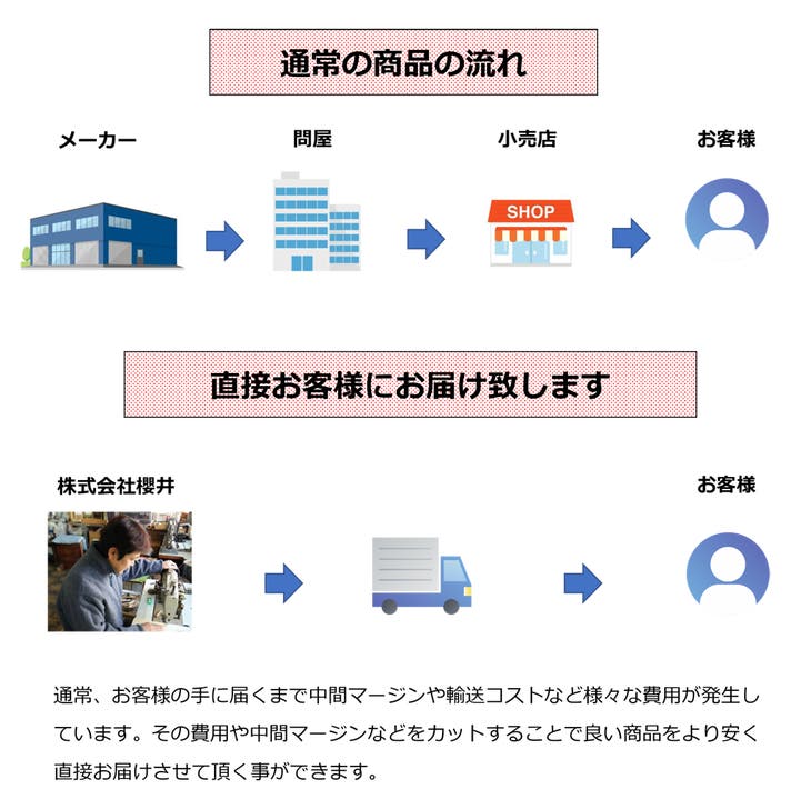 革屋さんから革を仕入れ、企画/デザイン~製造/お届けなど全ての作業工程を一貫して行っております。直接販売だからこそ、お客様より頂く直接のお声やご要望をすぐに反映させることもできます。