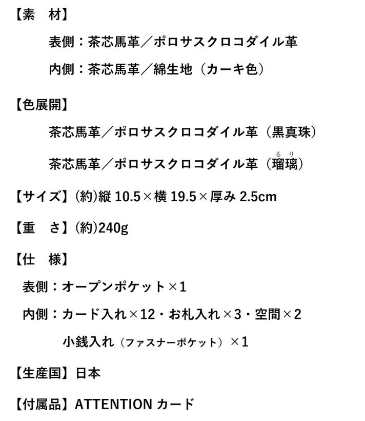 - 馬革原皮は世界有数の産地として名高いポーランド産。鞣しはイタリア・トスカーナ。財布の縫製は日本