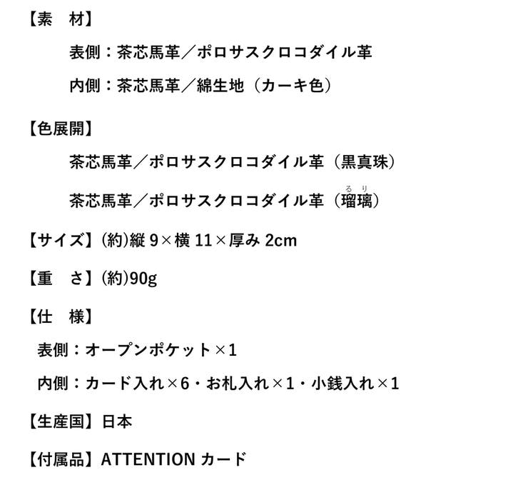今回のプロジェクト商品には付きませんが、弊社は日本製エキゾチックレザー製品の証(JRAマーク)を取得しているメーカーで、今回使用しているポロサスクロコダイルもワシントン条約に基づき正しく輸入された皮革を使用しております。