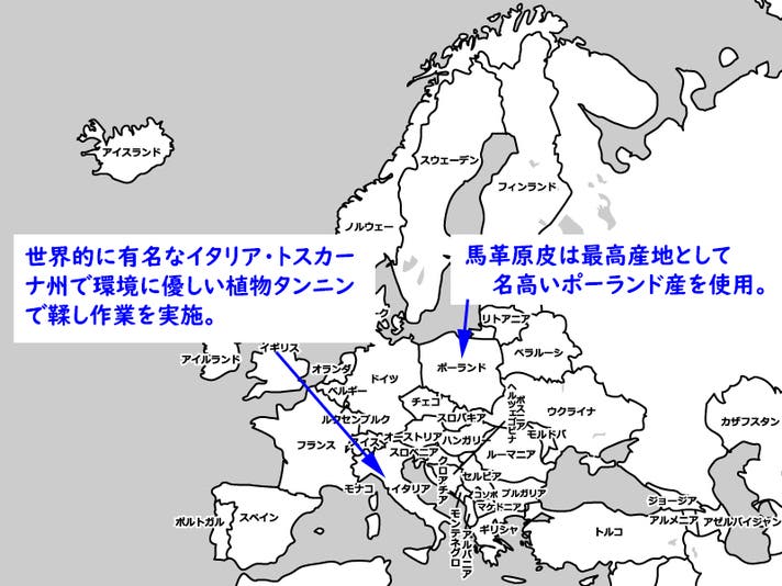馬革原皮は世界有数の産地として名高いポーランド産原皮使用。鞣しはイタリア・トスカーナ州で行っています。