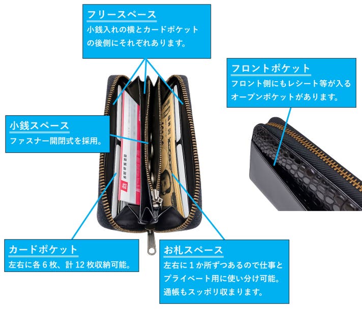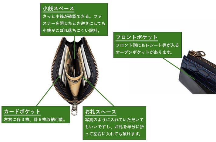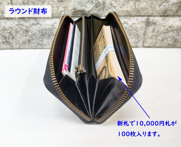 ラウンド財布においては通常より幅広タイプの8号サイズを使用。それにより収納力がより一層UPしました。