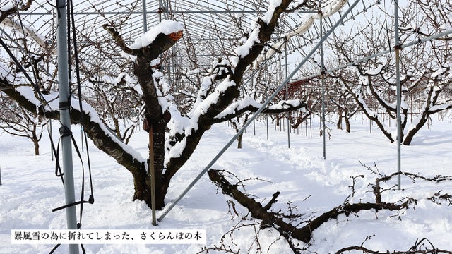 こうなっては大変!せっかく丁寧に育てて来た美味しいさくらんぼも作れなくなってしまいます。そうならないよう弊社では、折り重なる枝や太い幹に積もった雪下ろしなどの除雪作業を行っています。人手不足に加え高齢化が進んでいる現状ではこういった作業が疎かになってしまい、収穫高も減りますので引退される農家さんが年々増えている現状があります。