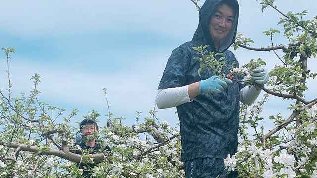 りんごの木の花摘み作業風景です。見渡す限りの園地を4〜5人で早朝から日が高くなるまでの間、2週間ほどかかって剪定します。