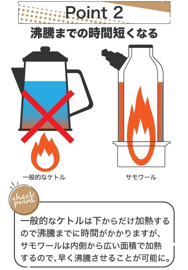 サモワールは、一般のケトルとの違いは圧倒的な加熱効率の良さにあります。