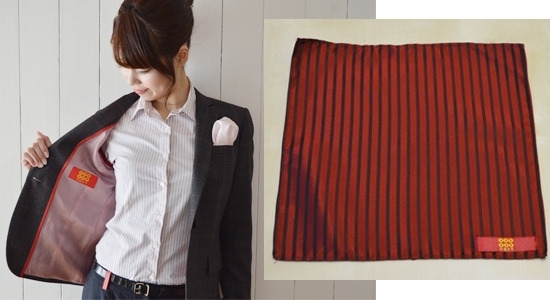 真田の赤備えをイメージした赤いポケットチーフ。不惜身命ネーム付。