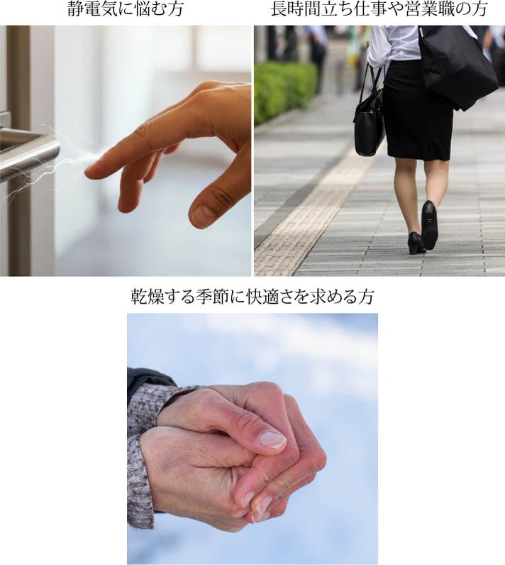 「LiLyモデル」は、足元にたまりやすい静電気を自然に逃がし、不快な“バチッ”や衣類のまとわりつきを軽減します。