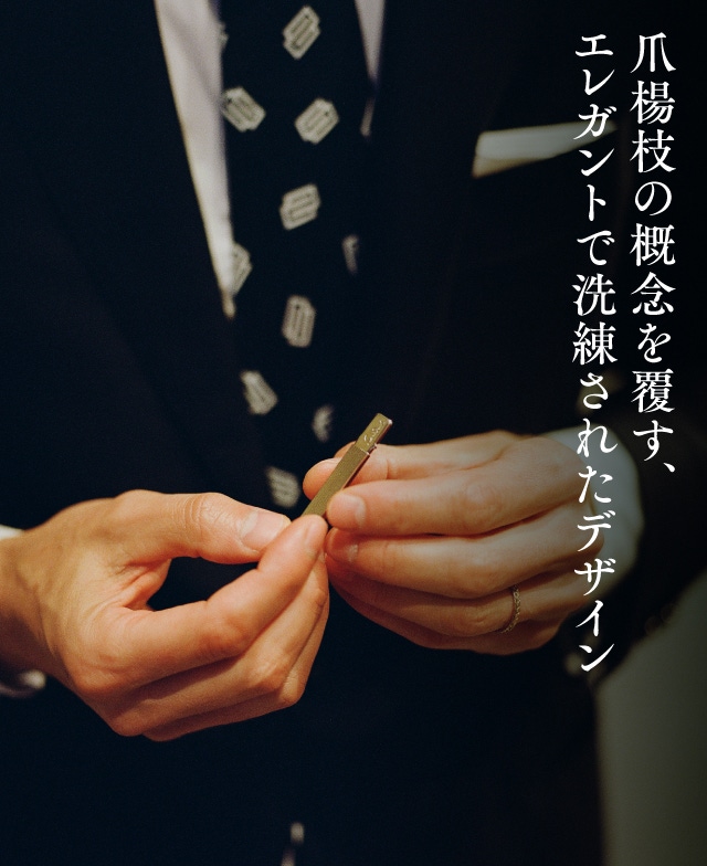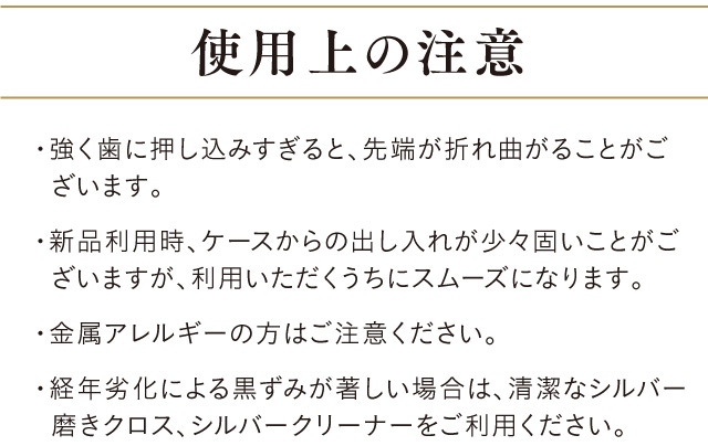 歯に触れるピック部分は、抗菌素材である非常に薄いシルバーでできた、一生モノのエチケットアイテム。