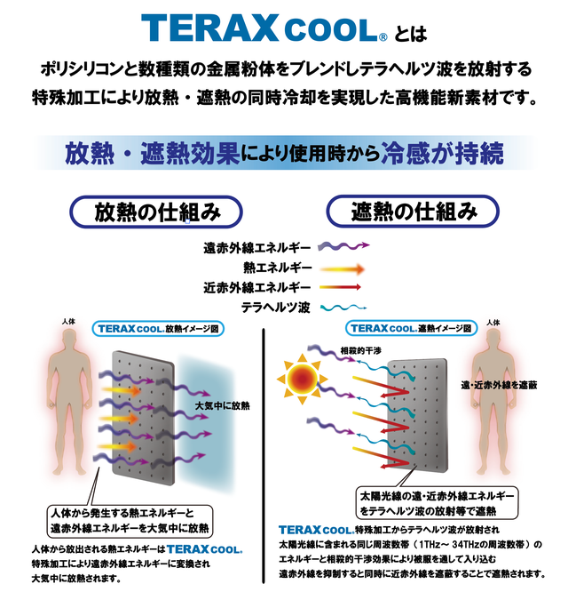 独自にブレンドした原料を素材に特殊加工することにより人体から発する熱エネルギーを放熱します。