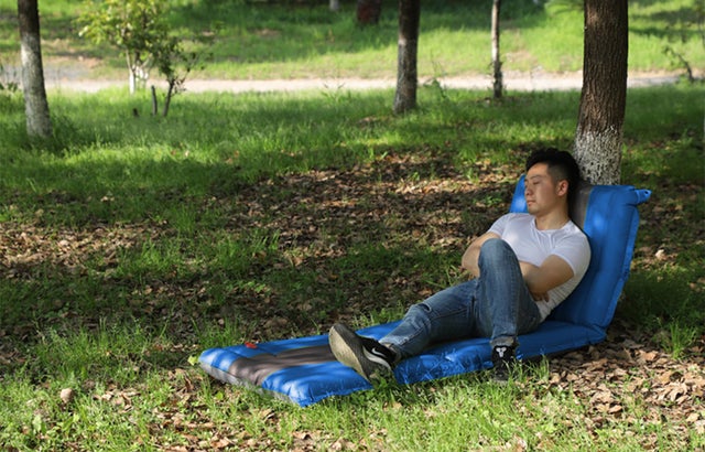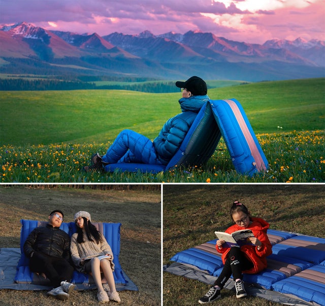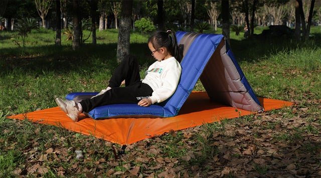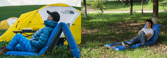 睡眠用のインフレータブルマットとしても、背もたれを曲げれば屋外用ソファーとしても使えます。「寝る」と「座る」両方使えるアウトドアの休憩を支える新発想のアイテムです。軽量でコンパクト足で踏むだけで空気入れも可能なアウトドアに最適です。