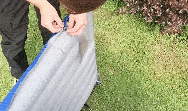 2way多機能エアーマットを斜めに折り、両脇のリングに紐を通して留めるだけ