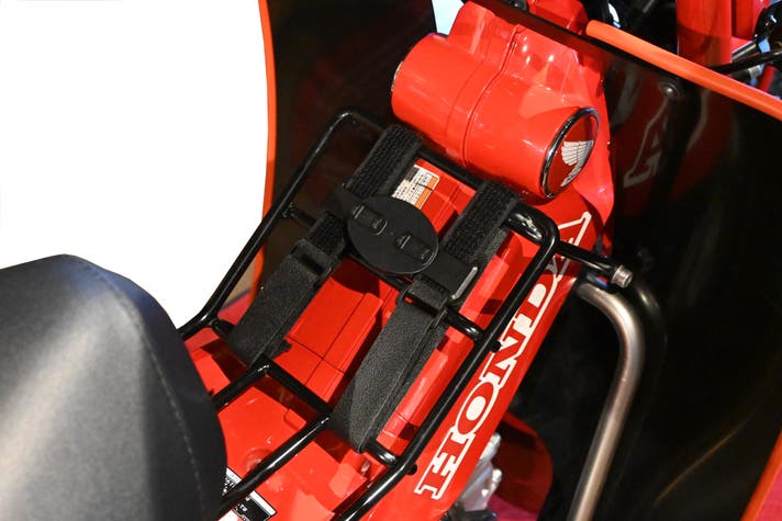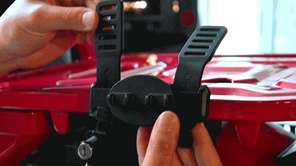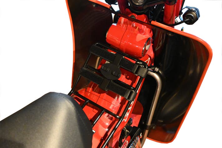 ※リアキャリア脱着イメージ(シリコンベルトの対応径は、約ø25mm - ø55mm(約直径25mm~55mmのバーやフレームに対応。)