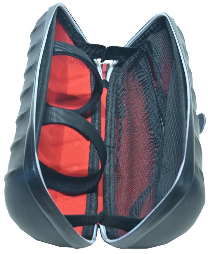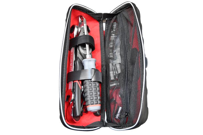 内側は起毛素材になっているので、面ファスナー(2本)付いているので取り付けることが可能です。面ファスナー(2本)で工具をまとめて束ねることが出来ます。フリーカットの面ファスナーを使用しているので、長さをご自身でカットして調整できるようになっています。