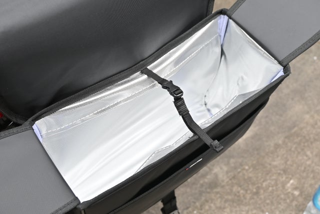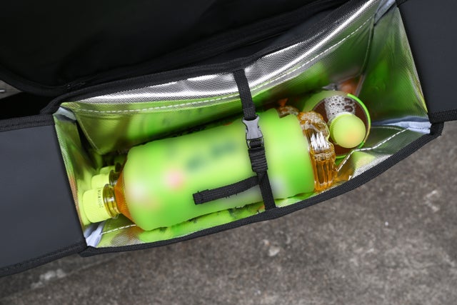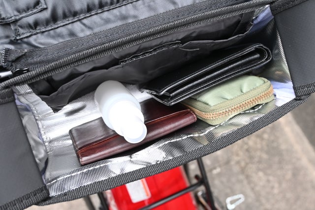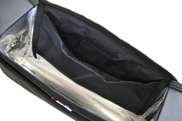 スマートフォン以外にも、バイクで持ち運びたい小物類(600mlのペットボトル2本)を収納できるスペースがあります。裏地は、アルミの蒸着素材を使用しているので、保冷・保温性に優れています。