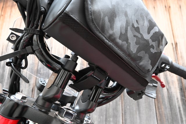 ハンドルバーバッグとは、ハンドル部分に固定する専用バッグのことです。荷物をハンドル部分に収納できるので、リアのキャリアバッグのように物を取り出すときにバイクから降りなくても取り出せる利点があります。