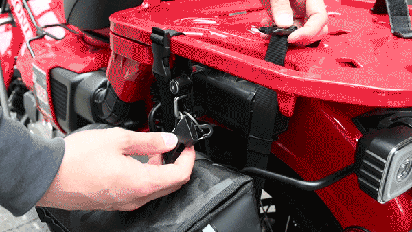 ①デイトナorキジマのサイドバッグサポートに本体背面に付いているループに差し込んで下さい。本体背面のループは2本付いておりますので、2本とも差し込んで下さい。