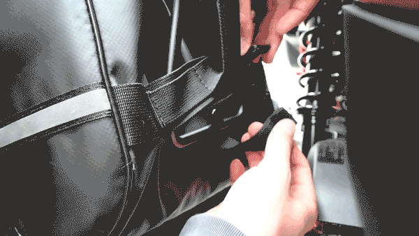 固定方法は、付属の上部ベルクロテープ(190mm2本)、下部ベルクロテープ(200mm1本)を使用し固定してください。3点固定式になっているので、走行時のバッグの揺れを防止します。