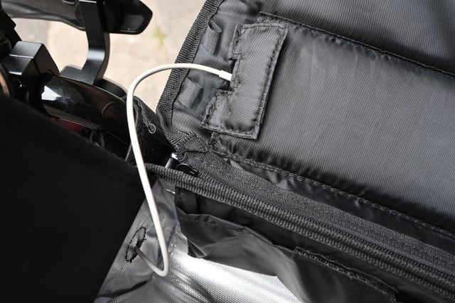 USB電源装置から充電できるように左ハンドル側にUSBケーブル(Lightning/MicroB/Type-C)などが通せるようになっており、スマートフォンを入れながら充電することが出来ます。