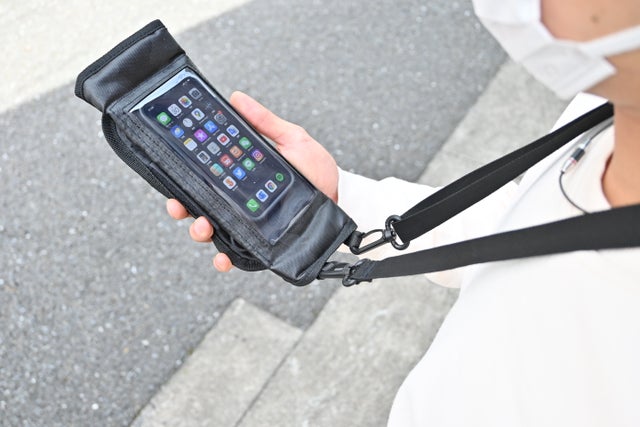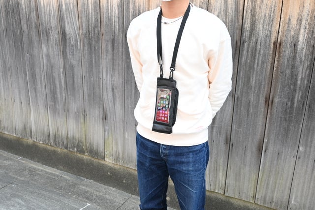 透明PVC素材の窓付きになっておりますので、スマートフォンを入れてタッチパネル操作が出来るようになっています。スマートフォンに反応するグローブであれば、透明ビニール越しに操作が出来ます。