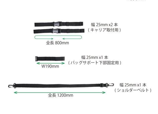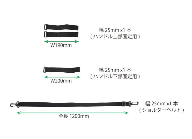 ショルダーベルト1本、バックル付きベルト2本、ベルクロベルト1本が付属しています。