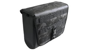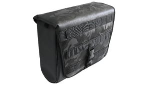 フラップは黒迷彩柄撥水素材、本体はPVCターポリン防水素材を使用しています。裏地は、防水性のあるアルミの蒸着を使用していますので、保冷・保温効果があります。(※完全防水ではありません。)メインポットは、中の物が取り出しやすいように開口部を大きくしています。カードケースやコインケースなどを入れるのに便利な吊り下げポケットも装備しています。