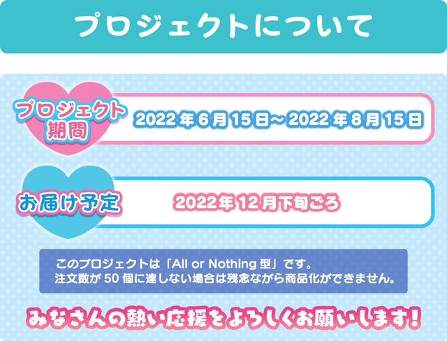 ※このプロジェクトはAll or Nothing型となり、プロジェクト期間内に目標金額に到達しない場合は商品化ができません。