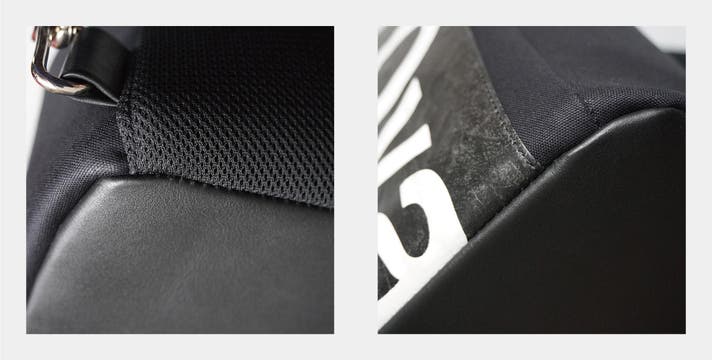 軽さと耐久性の両立を図るため、すべてを革にせず、必要な部分のみにレザーを配置。本体には10号帆布を採用し、軽量設計と堅牢さを両立させています。