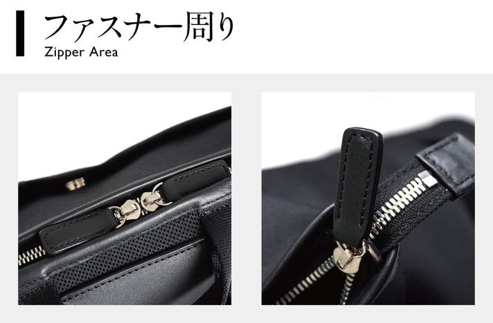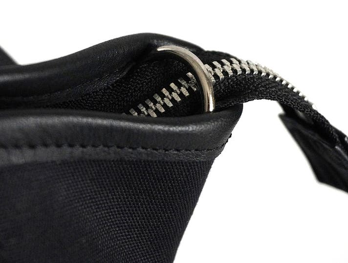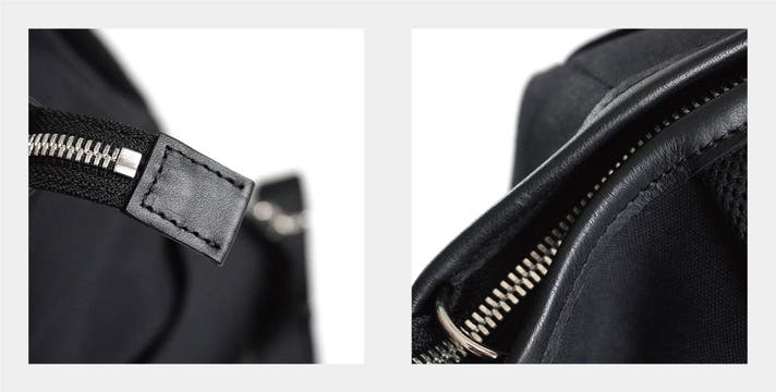 開口部には革のパイピング処理を施し、形崩れしにくい上質な仕立てに。ファスナーエンドにも姫路レザーをあしらい、使い続けても安心の堅牢性を高めています。