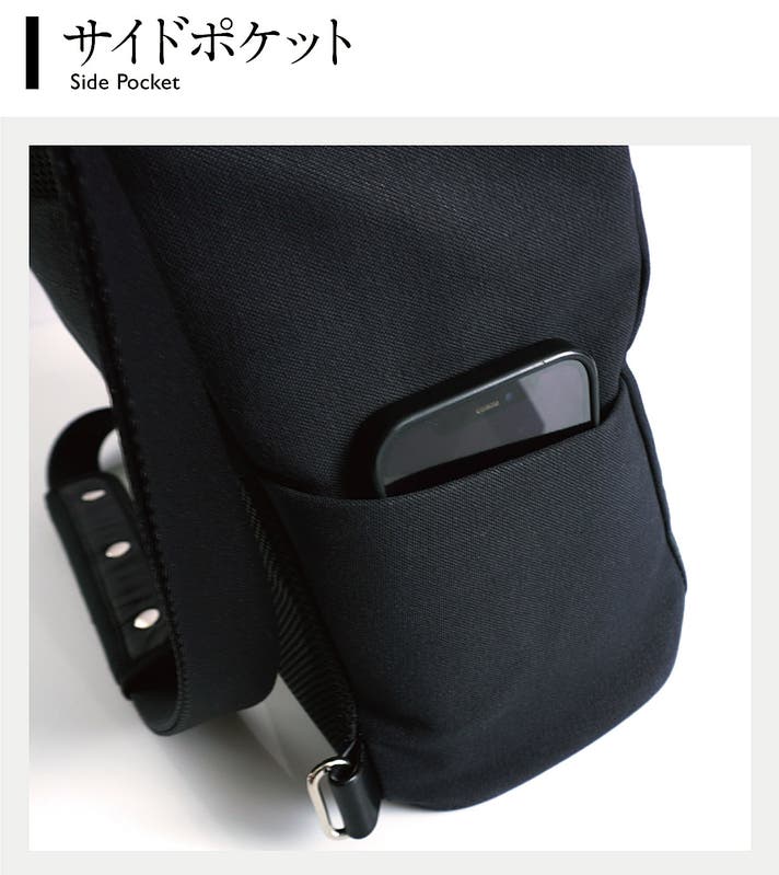 スマホがすっと収まるサイドポケットを、両側に配置しています。
