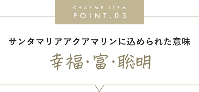 そのため、心身を平穏にし、幸福な日々を過ごしたい時、冷静に物事を見極めたい時など、サンタマリアアクアマリンに込められた力が、内に秘められたアナタだけの魅力を引き出し、お守りとなってアナタの手助けになってくれるかもしれません。