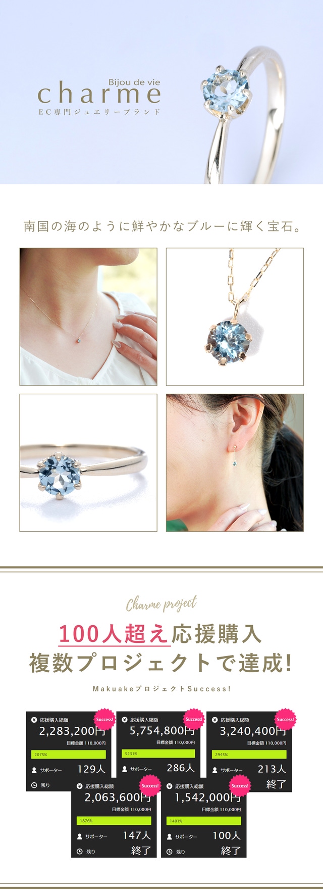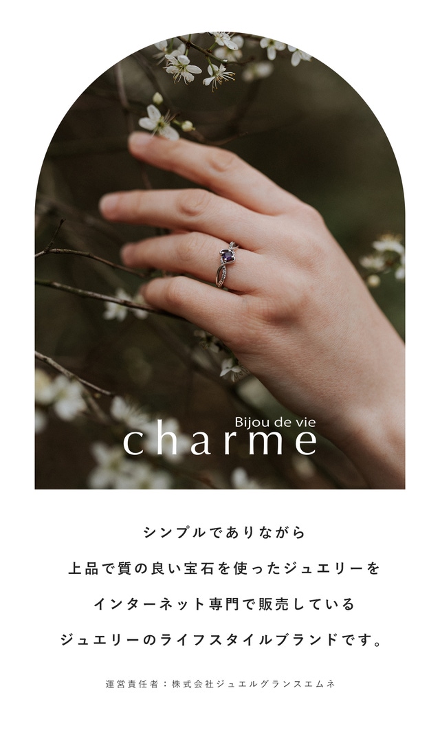 『charme』では、宝石の仕入れ方法やルートの開拓を徹底し、さらに通販限定にすることで中間マージンをカット。レアストーンや10金を使用したジュエリーにもこだわりつつも、お⼿にとっていただきやすい価格を実現できたと⾃負しております。