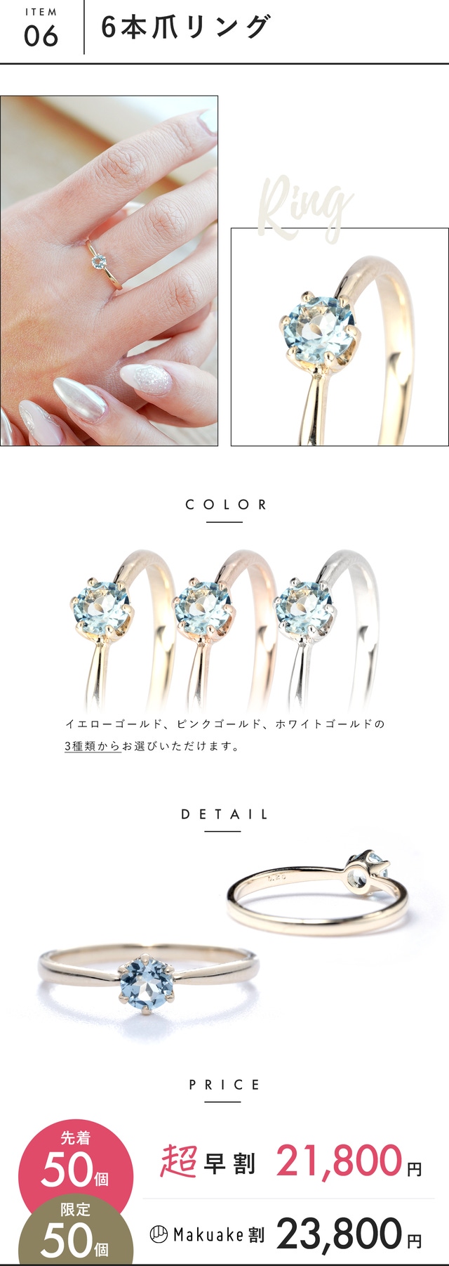 【Makuake割】サンタマリアアクアマリン 6本爪リング r1