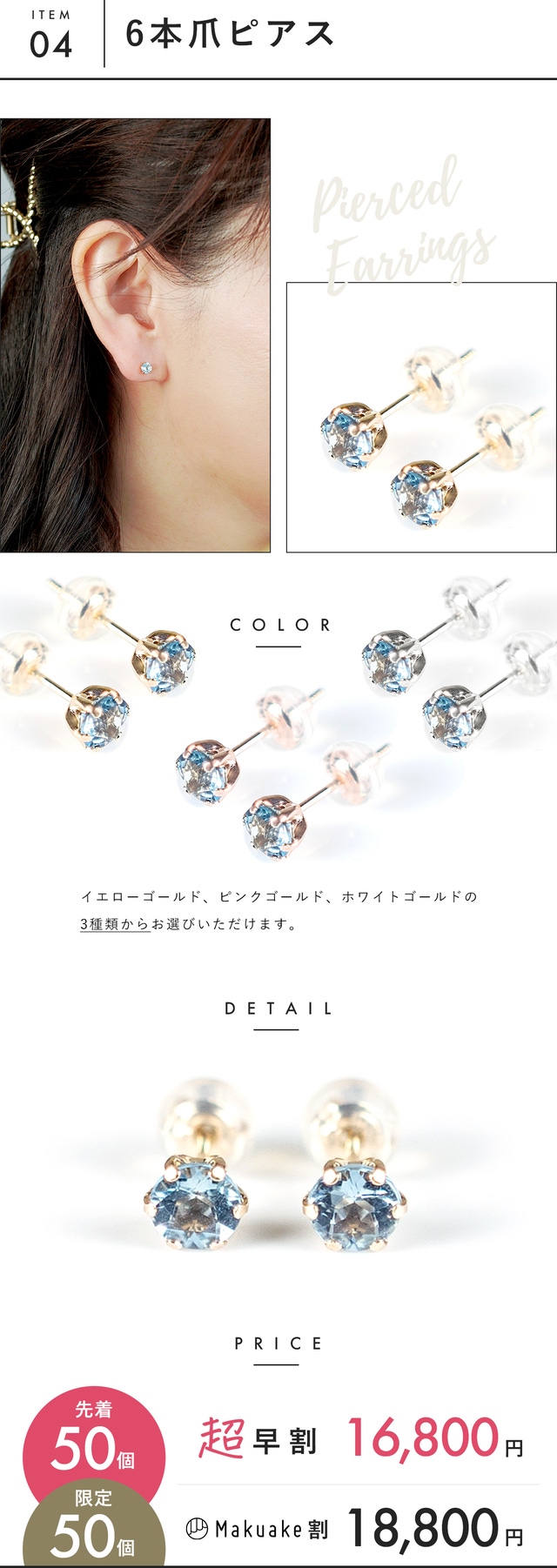 【Makuake割】サンタマリアアクアマリン 6本爪ピアス p1