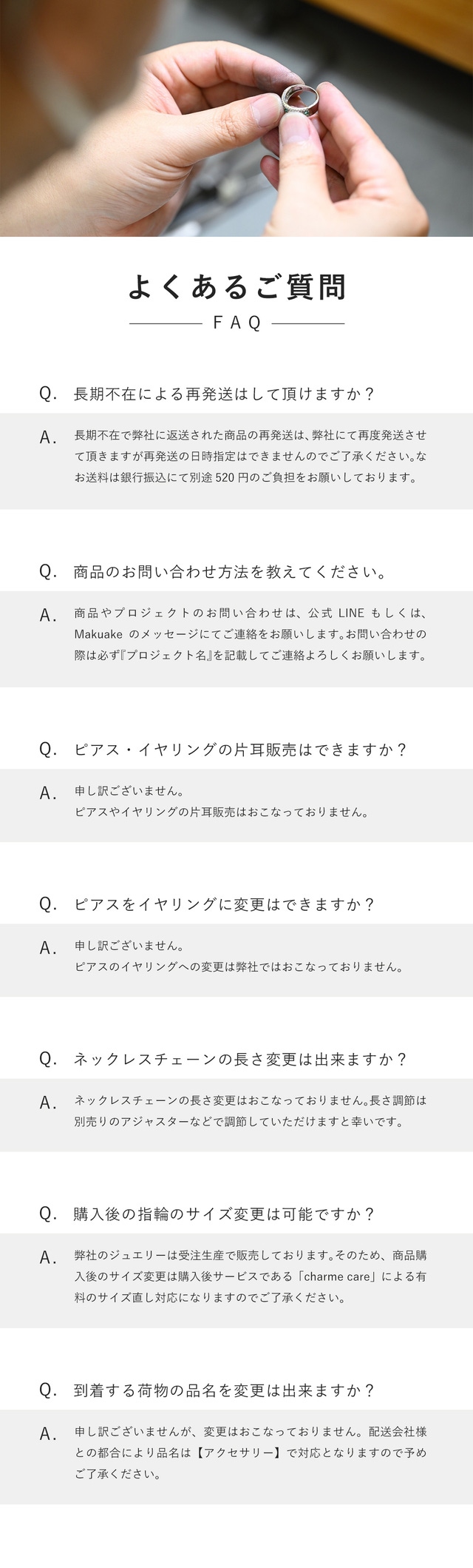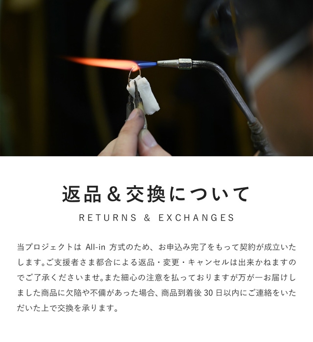 私たちは【シャルムジュエリー】を制作するために、工場とデザイン・仕様を実現できるよう、プロジェクトを誠心誠意進めています。 しかしながら開発中の工程において、デザイン・使用が一部変更になる可能性もございます。製造スケジュールについては、プロジェクト成功を想定した数で調整しておりますが、想定を上回る応援の申し込みがあった場合、製造や発送に伴うやむを得ない事情によりお届けが遅れる場合がございます。上記のようにプロジェクトページに記載している内容に変更がある場合は、活動レポートなどで共有を行っていく予定です。 本文中に記載させていただいたスケジュールは、あくまでプロジェクト公開時点の予定です。応援購入の性質上、配送遅延のおそれがございます。 原則として、配送遅延に伴う応援購入のキャンセルはできませんが、リターン配送予定月から3ヵ月を超えた場合には、希望者に限りキャンセルにて対応させていただきます。