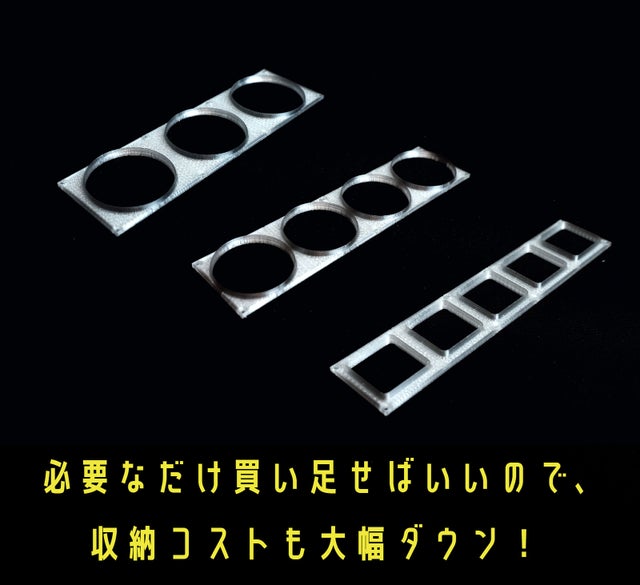 私の個人的な趣味から始まった今回のプロジェクトですが、数々の試作を経てここまでたどり着きました。 私自身が模型作成をしている上で、塗料瓶がボックスの中でバラバラになってしまい悩んでいました。 オーガナイザーを使用することで、ボックスの開閉や移動によって瓶がバラバラになる事がなくなりました。 固定出来るようになると、整頓のルールにも拘りが出来ました。 新しい塗料を買う事も楽しみになってしまいました。 是非皆さんにも自由に整頓できる楽しさを、体験して頂きたいです。 写真は3Dプリンターを使用した試作品になります。 出荷用の製品とは異なります。 製造の過程でデザイン・寸法の調整を行う可能性があります。 また、応援購入数が想定を上回った場合、製造工程の都合などにより製品出荷が遅れてしまう場合があります。 本文中に記載させていただいたスケジュールは、あくまでプロジェクト公開時点の予定です。8月末からの商品発送を予定しておりますが、応援購入の性質上、配送遅延のおそれがございます。 原則として、配送遅延に伴う応援購入のキャンセルはできませんが、リターン提供予定月から6ヶ月を超えた場合には、希望者に限りキャンセルにて対応させていただきます