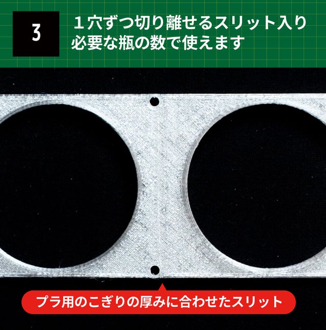 よりジャストサイズで使いたい方のために、穴1つずつ切り離せるスリットをつけました。プラ用のこぎりの厚みと同じ幅のスリットなので、簡単に切り離せます。