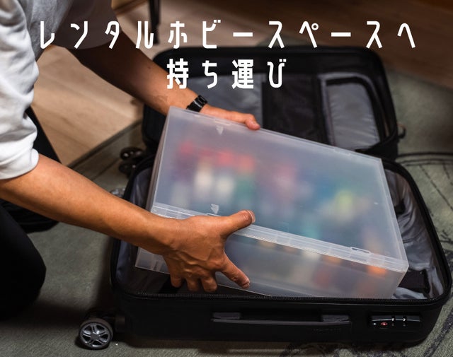 レンタルホビースペースを利用するときは、オーガナイザーを使用した収納ケースごと持ち運びできます。持ち運んでも、瓶が当たったりずれたりしないので、割れにくくなります。(収納ケースや塗料瓶のサイズによっては緩衝材をお使いください。横方向の力には強いのですが、上下方向には瓶が動くことがあります)