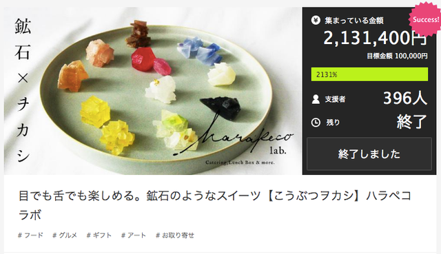 達成率2131パーセント。鉱物みたいなお菓子、「こうぶつヲカシ」の紹介。