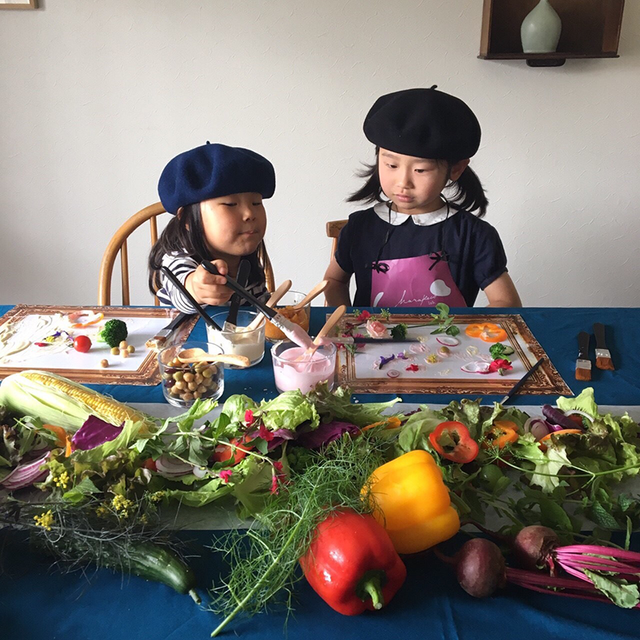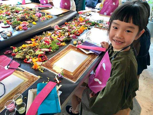お野菜のソースで思い思いに絵を描いていき最後には食べて無くなる食育プロジェクト。可愛い紙製のエプロンもハラペコラボオリジナルデザイン。