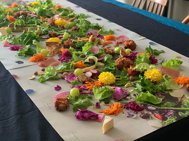 ひと続きのサラダを中心としたお料理がテーブルいっぱいに広がり、会場を華やかに彩ります。我々が考えたこのサラダロード をオーダーにてサービスを提供しております。