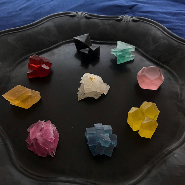 「石みたいなおやつを創れないか」の声にお応えし、琥珀糖という寒天とグラニュー糖の和菓子を鉱石に見立てて制作しました。
