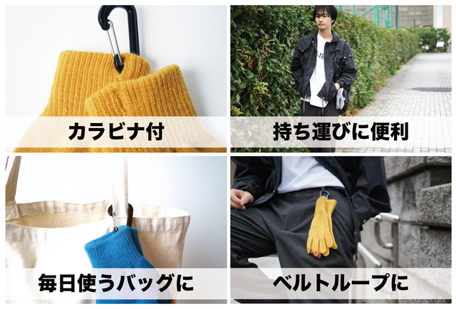 手袋を使用していない時に、カバンなどに取り付けられるよう、専用のカラビナを付属しました。失くしがちな小物類をまとめるのにも便利です。