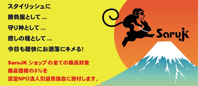 私、SaruJK(サルジョッキー)は"出来る事から始める"をテーマに、日常の有りそうで無いモノ・こんなモノが欲しかった!という気の利いたアイテムをデザインして、ご購入いただく。そして引退した競走馬に少しでも寄与出来ればという思いで活動しています。
