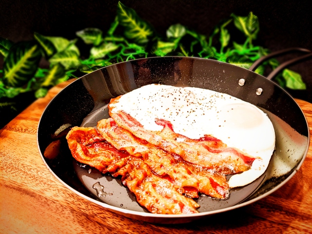 黒豚のトレオニン(アミノ酸)含有量は一般的な白豚の約6.7倍ととても高く、ベーコンをグリルすると豊富なアミノ酸や糖などの成分がメイラード反応という化学反応を起こし褐色で香ばしい風味になります。