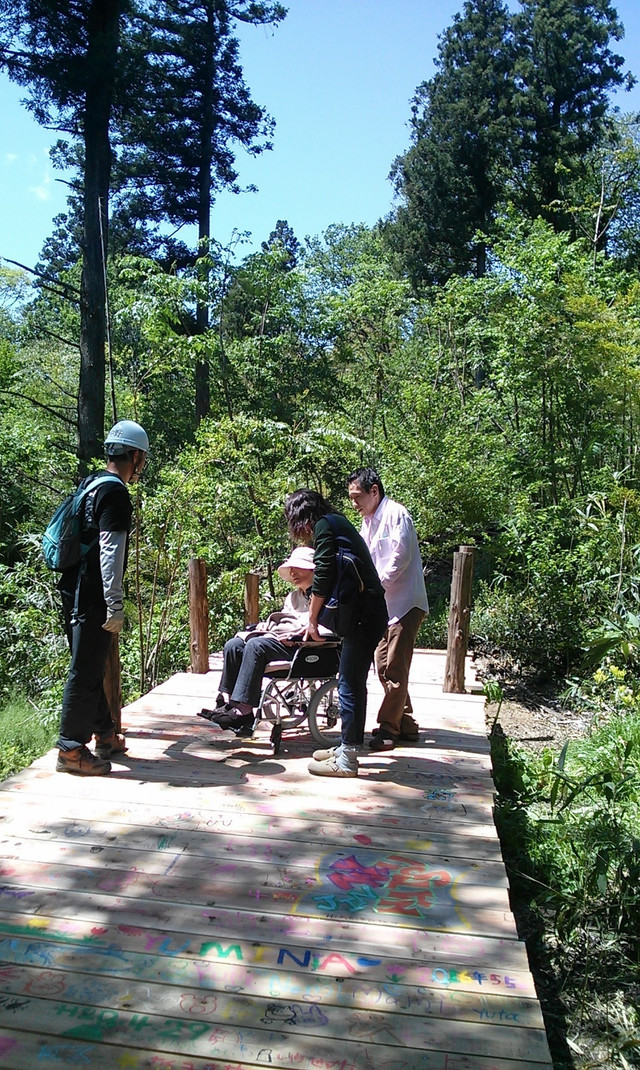 この木道は、介護施設から外へ出たお年寄りが自然に触れ合い、傍らで遊んでいる子ども達がおじいちゃんから森の話を聞く。乳幼児を連れたベビーカーのお母さんたちが森林浴を楽しむ。車いすの子どもが虫取りをするなど、多様な立場の人々が交流し、自然からの恵みを共有しているシーンの実現を目指しています。