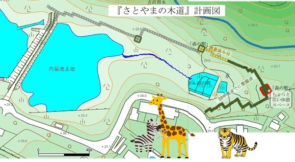 『さとやまの木道(こみち)』の全体構想は下の図のようです。富山市ファミリーパーク内のキリン舎の裏から出発して、森の中を抜け、池の周りを巡って、既設の舗装道路につながる、およそ300mで、舗装道路260mを利用したおよそ560mの周回路とする計画です。