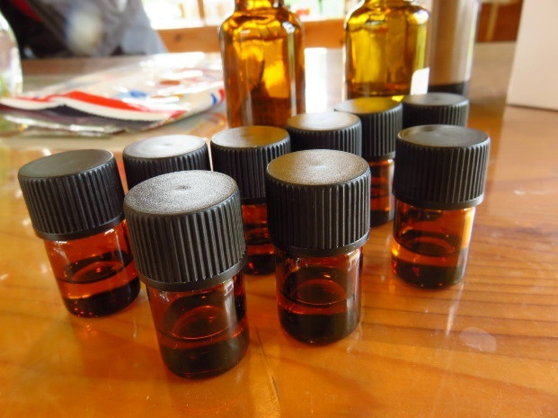 (5) クロモジのエッセンシャルオイル5ml(クロモジは、昔から楊枝などで親しまれている木です。香りにはリラックス効果があると言われており、絶滅危惧種ローズウッドに匹敵すると言われています。里山整備の折に際に採取し、自家蒸留したオイルです)