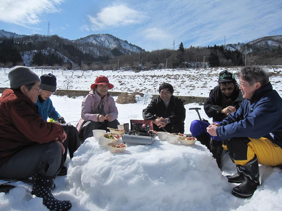 たっぷり遊んだあと、雪でテーブルを作って、熱いチーズフォンジュを楽しみます。